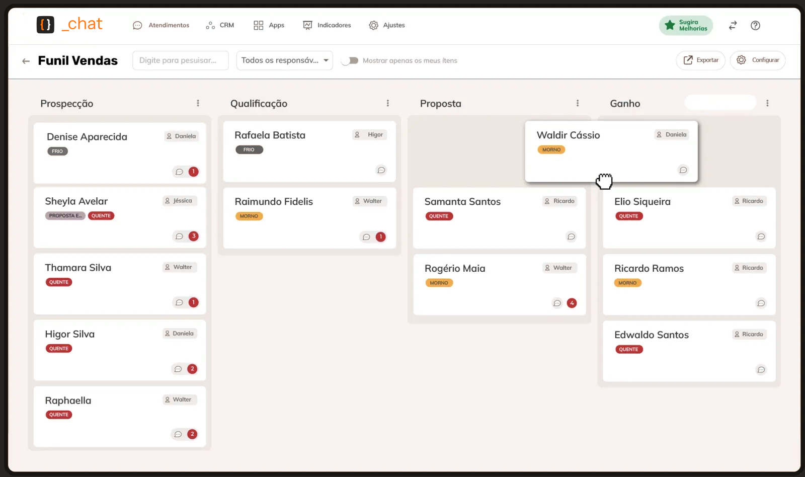 Acompanhe cada lead em tempo real. Arraste e solte para mover entre as etapas do seu funil personalizado.