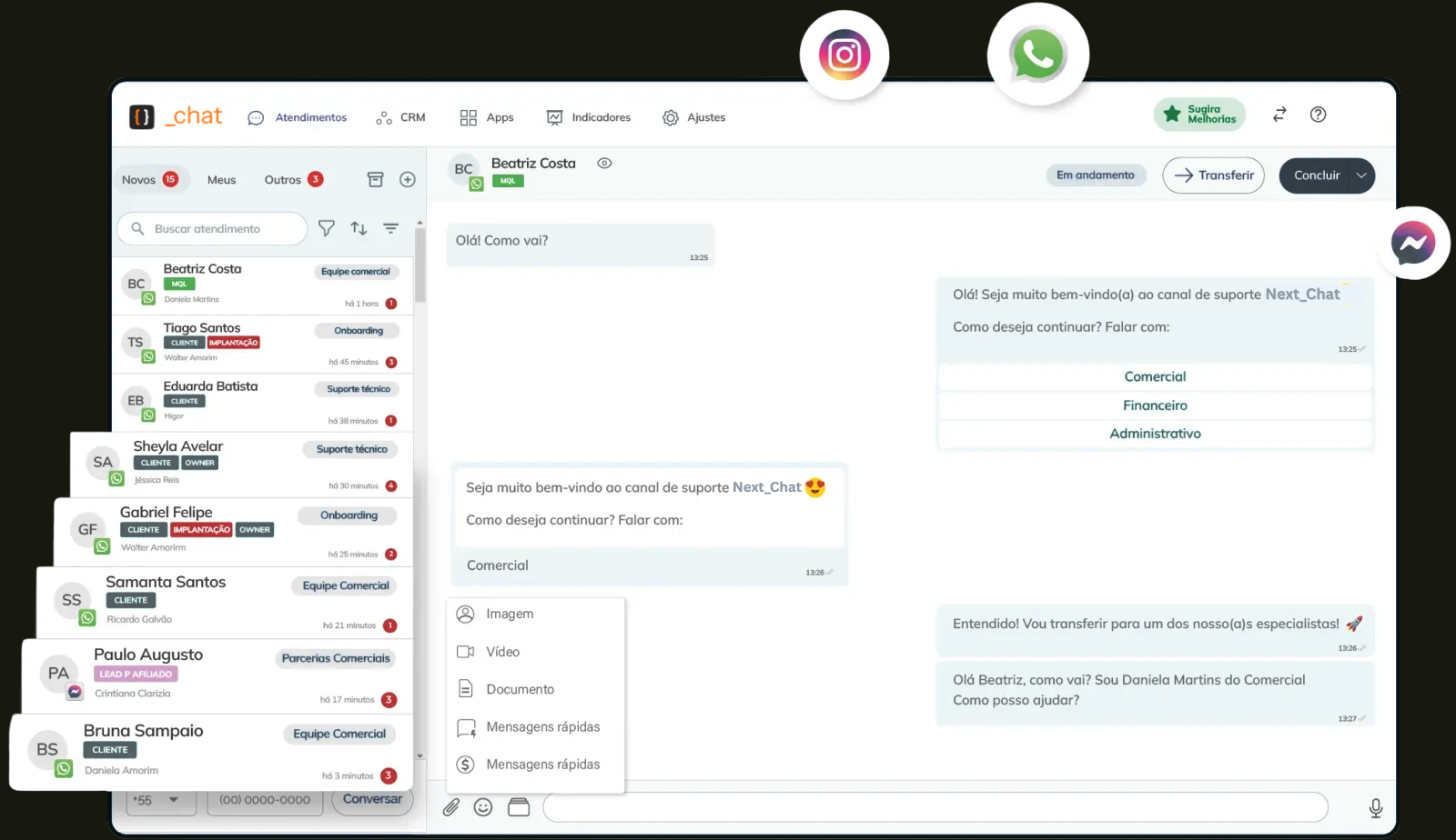 Todas as conversas de WhatsApp, Instagram e Messenger em um único lugar. Organize filas e distribua atendimentos automaticamente.